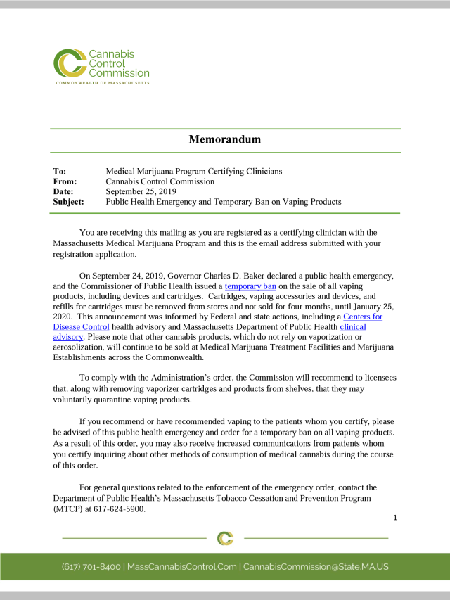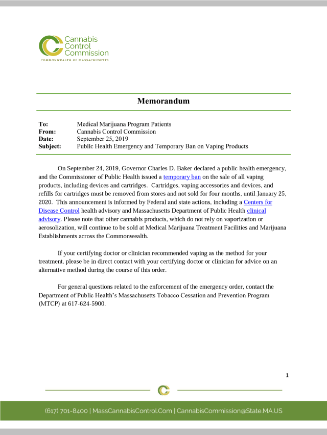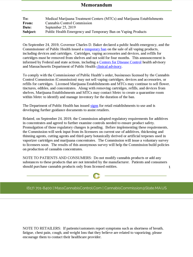 Cannabis Control Commission issues three memos regarding vaping. Posted bywsullivan33 September 28, 2019 Leave a comment on Cannabis Control Commission issues three memos regarding vaping. Share this: Share on X (Opens in new window) X Share on Facebook (Opens in new window) Facebook Like Loading...