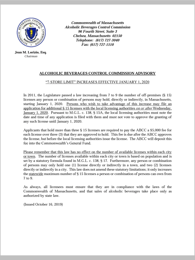 Posted bywsullivan33October 15, 2019Posted inUncategorizedTags: ABCC Advisory 7 to 9 Store Limit
