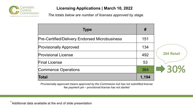 Cannabis Control Commission Licensing Data, includes 400 cannabis retail stores approved for licensure with 204 of those retail stores that have commenced operations. Data for other types of licenses are also listed.